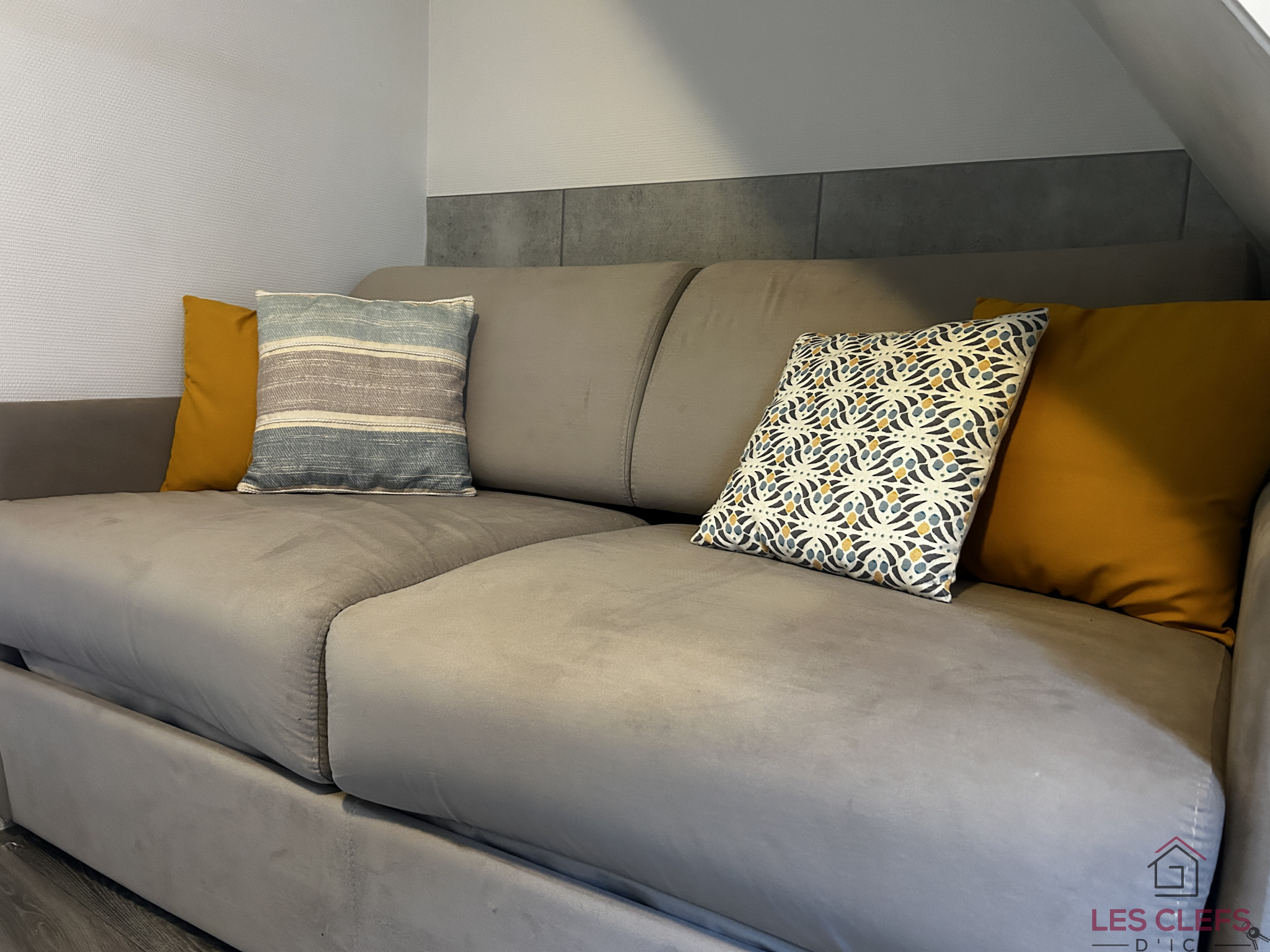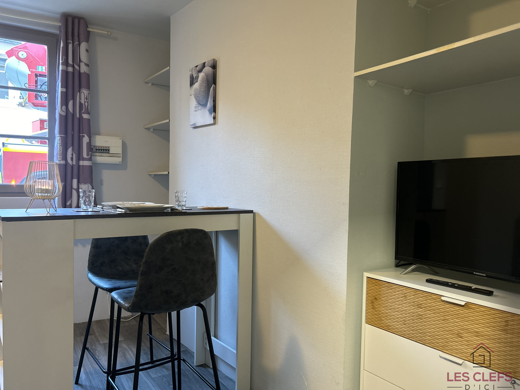 Description du Bien : Ce Studio de 20m² se compose d’une pièce principale, équipée d’un canapé convertible avec un matelas épais qui est adapté à un usage quotidien, table/bar, TV, commode, boitier fibre présent.