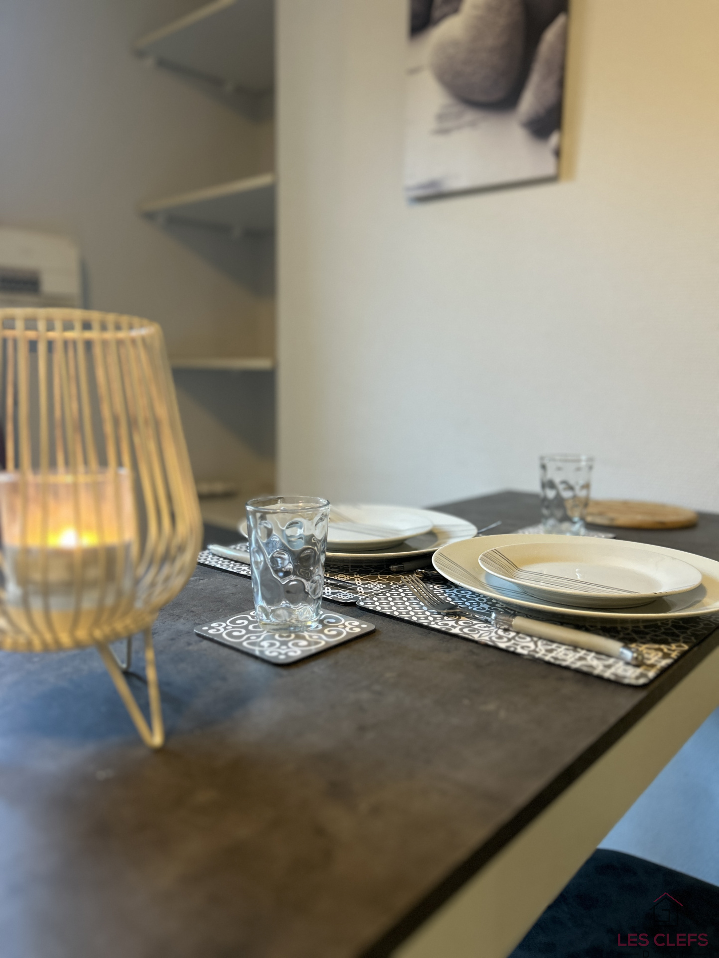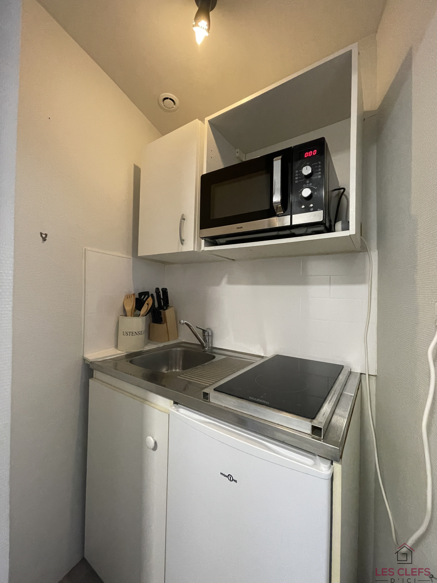 La cuisine, équipée aménagée, offre tout le confort nécessaire pour votre quotidien. Micro-onde, plaques de cuisson à induction 2 feux, Réfrigérateur/congélateur, ustensiles de cuisines et vaisselle.