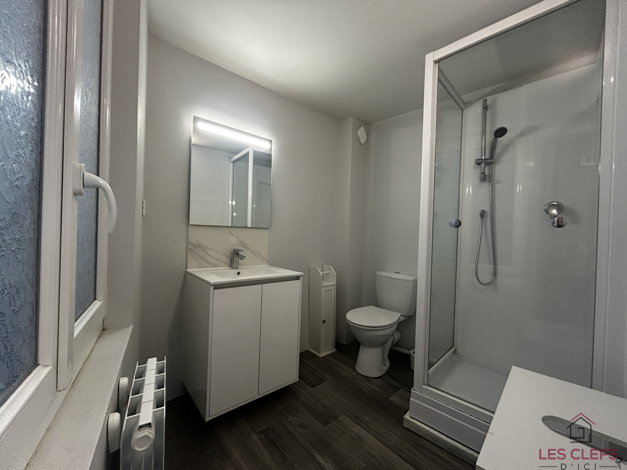 Une salle d’eau comprenant douche, meuble vasque, WC, rangements, sèche serviette électrique et ballon d’eau chaude extra plat a économie d’énergie.