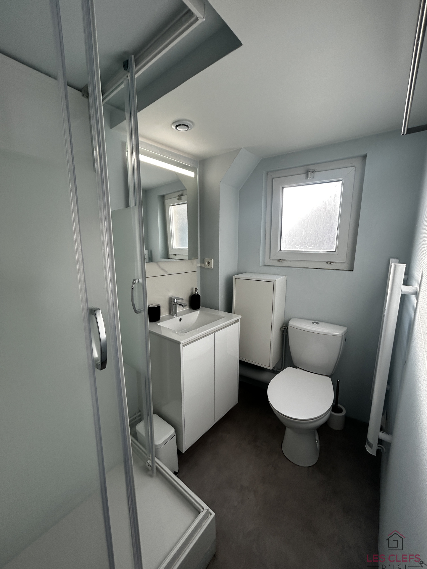 Une salle d’eau comprenant douche, meuble vasque, WC, rangements, sèche serviette électrique et ballon d’eau chaude extra plat a économie d’énergie.