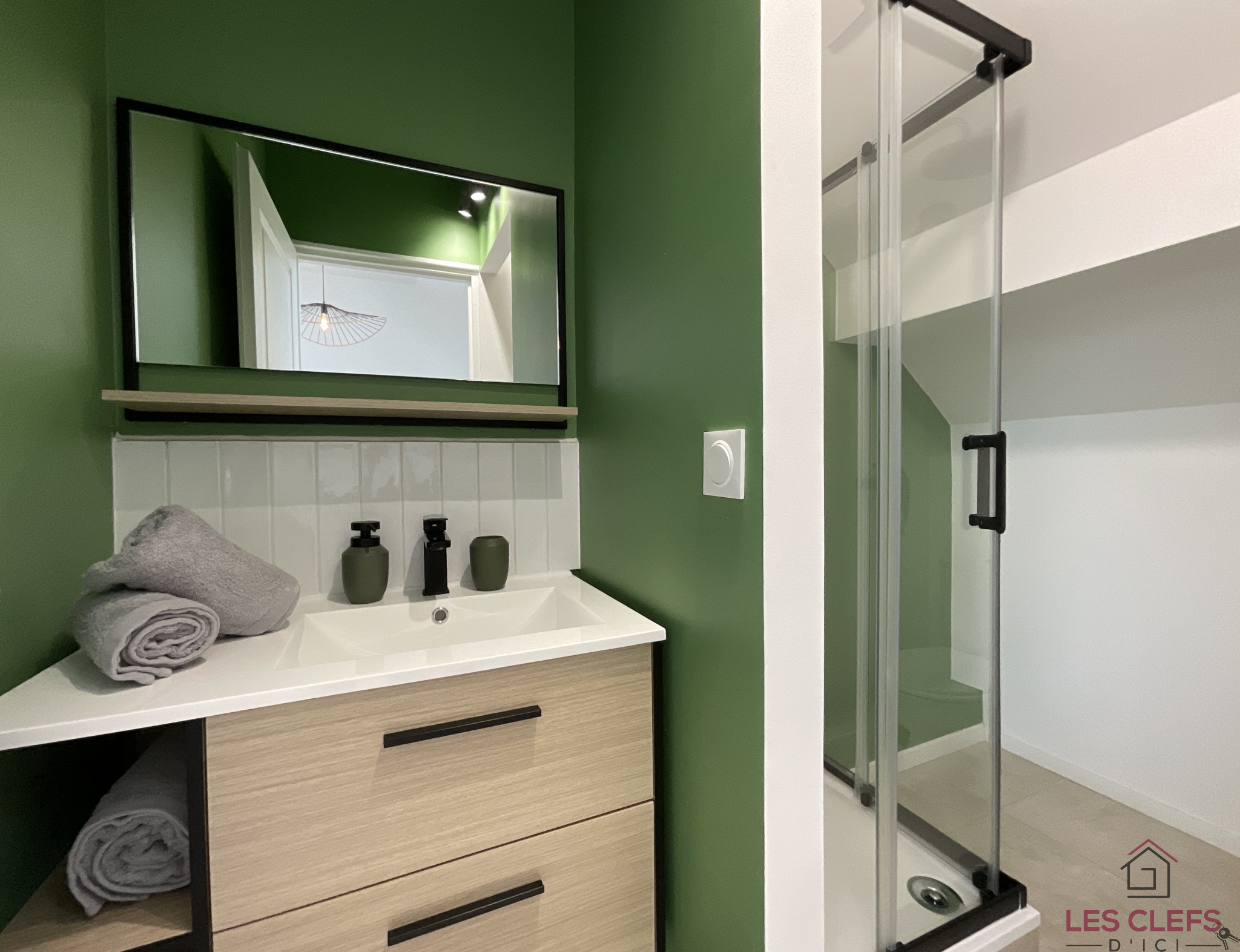 Une salle d’eau comprenant douche, meuble vasque et WC