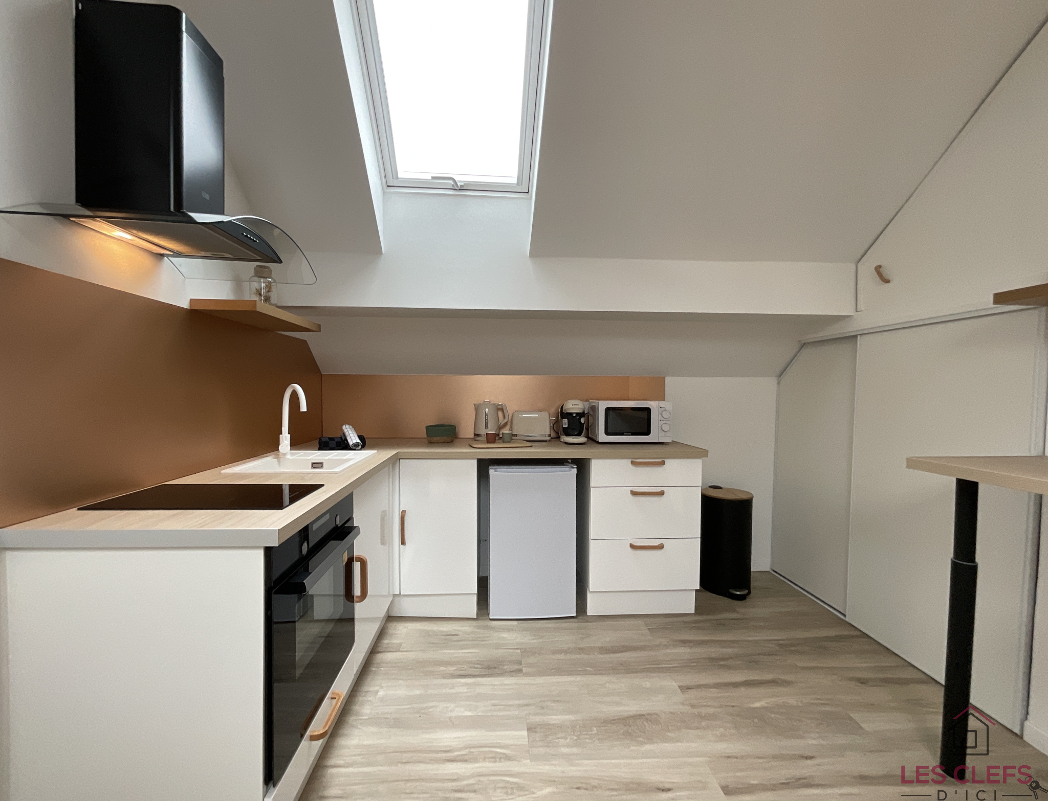 La cuisine, équipée aménagée, offre tout le confort nécessaire pour votre quotidien avec plaques de cuisson à induction, hotte, micro-ondes, frigo.