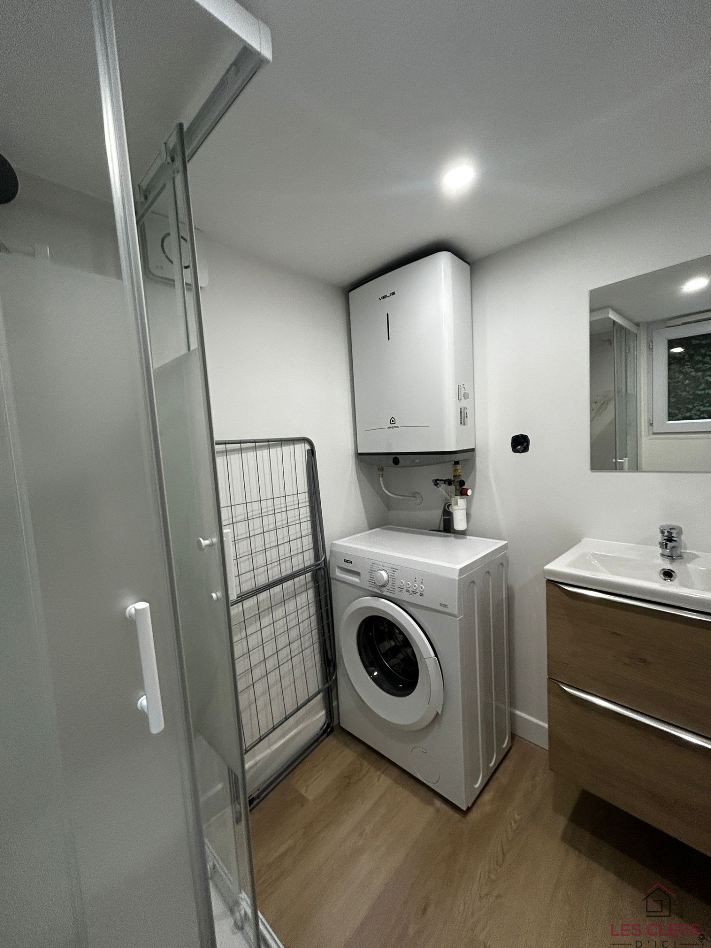 Une salle d’eau comprenant douche, meuble vasque et WC.